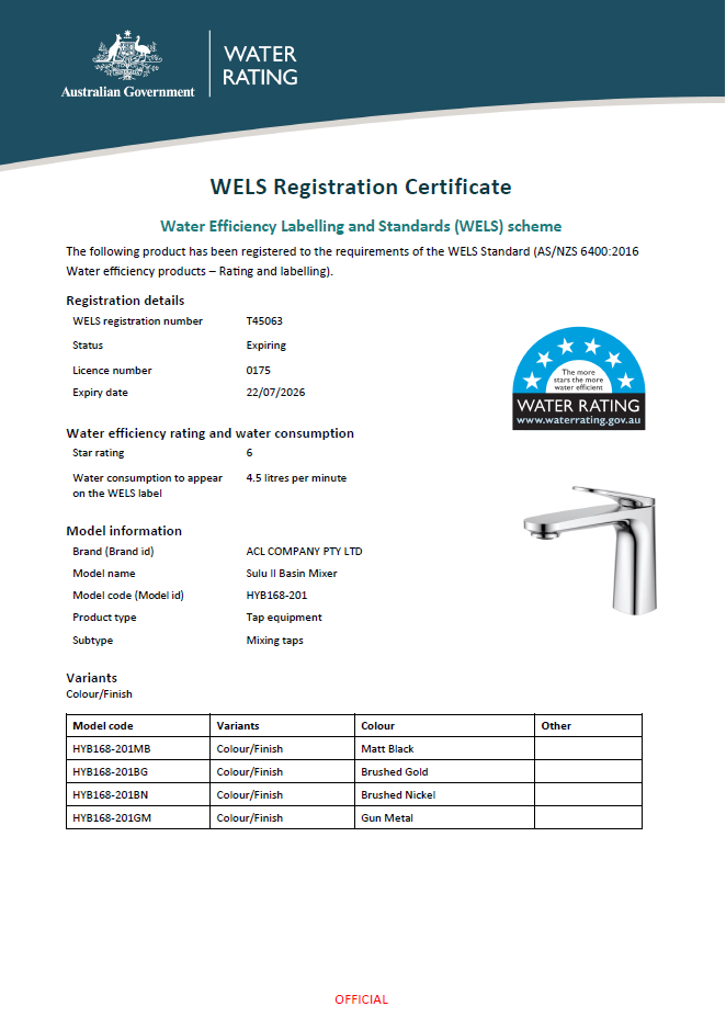Available in 5 colours: Chrome, Brushed Nickle, Gun Metal, Black, Brushed Gold